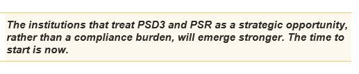 PSR obligations may become binding before PSD3 is transposed in certain jurisdictions. Compliance timelines for the two instruments may differ, and firms must plan accordingly.